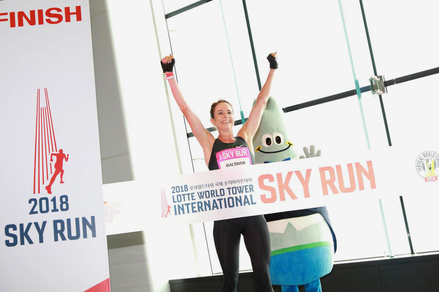 A very happy Suzy Walsham crosses the finish line at the top of Lotte Wolrd Tower. ©Sporting Republic