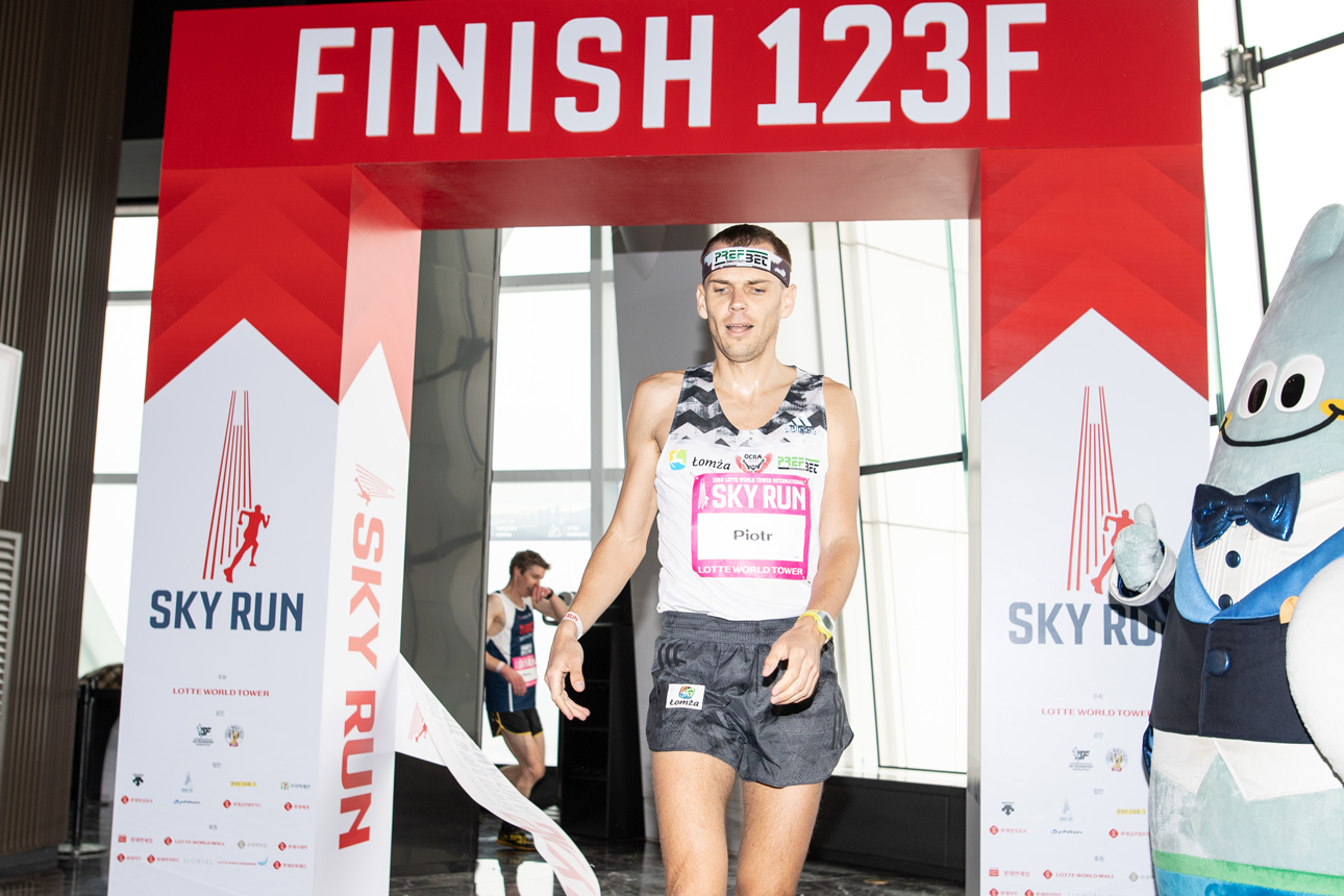 Another win. Another record. Five-time VWC champion, Piotr Lobodzinski crosses the finish line on the 123rd floor of Lotte World Tower. © Sporting Republic