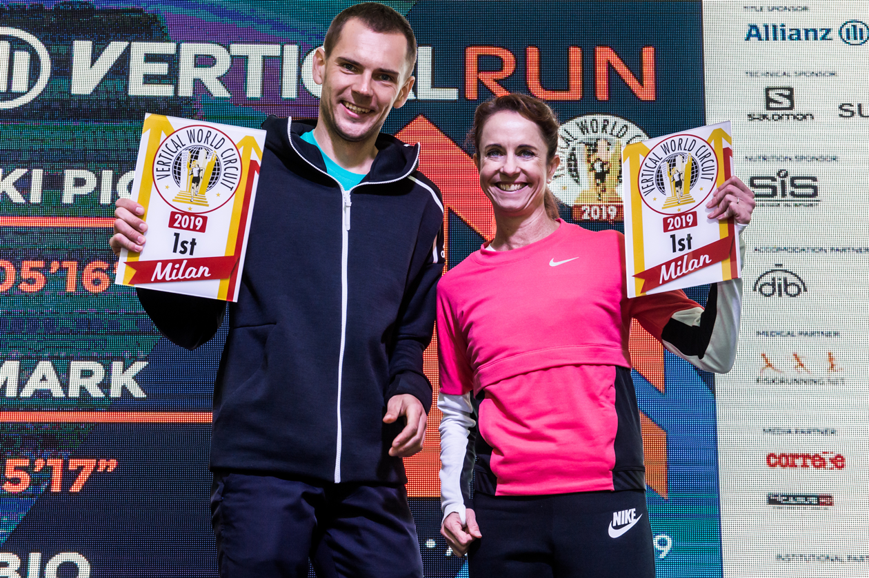 Winners Lobodzinski and Walsham take the first Allianz Vertical Run in the VWC. ©AllianzWith the world’s top athletes congregating in Milan for the second stage of the Vertical World Circuit®, jaw-dropping performances were in order. The second edition of the Allianz VERTICAL RUN held on Sunday, April 14, saw some 500 athletes from 22 countries take to the stairs – 1, 027 steps, 49 race floors and 200 metres inside the Allianz Tower.