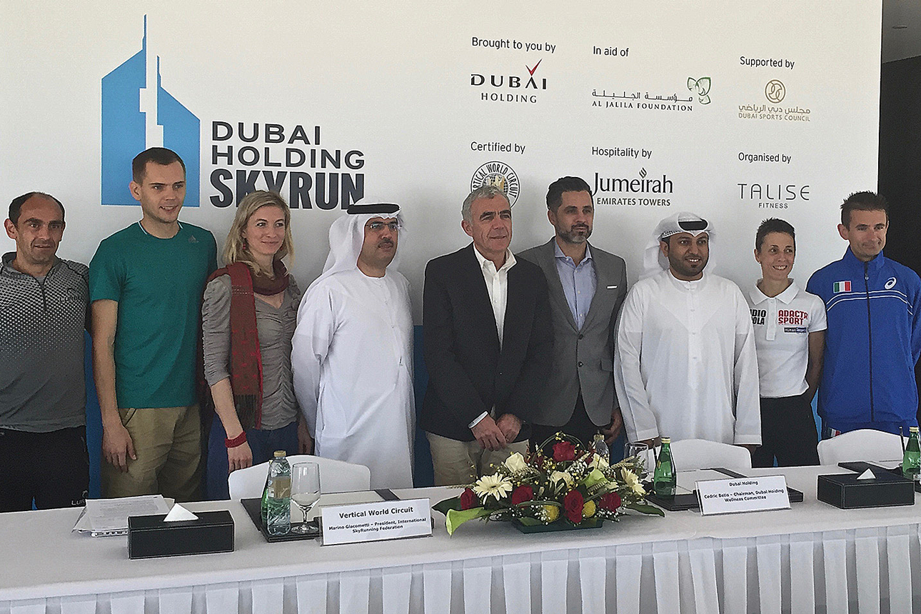 ISF President Marino Giacometti (centre) with organisers and athletes at the 2016 Dubai Holding SkyRun. ©Dubai Holding SkyRun
