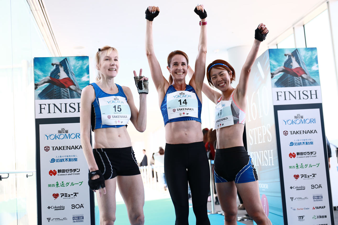Harukas Skyrun women’s podium with Laura Manninen, second, winner Suzy Walsham, and Yuko Tateishi, third . ©Sporting Republic